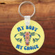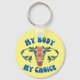 Pro-choice word art keychain features "my body my choice" in retro style blue text with floral uterus graphic on yellow background