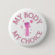 Show your support for women's rights with this pro-choice pin back button design featuring a pink raised fist in center with "my body my choice" text.