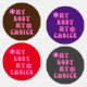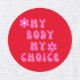 Show your support for women's fundamental rights with this iron on round label design that features "my body my choice" text in pink retro 1970s style font on 4 different colour backgrounds