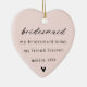 Celebrate your bridesmaid and best friend with this beautiful Christmas ornament, a perfect keepsake to honour her special role in your wedding. Featuring a heartfelt message and elegant design, it's a thoughtful way to show your appreciation during the holiday season. Personalise it with her name and wedding date to create a lasting memory she'll cherish year after year.