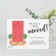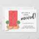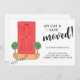 This moving announcement card features a red door and pot plants with kitty paw prints and stylish typography.