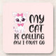 Answer the call of feline love with this 'My Cat Is Calling and I Must Go' coaster! Featuring an elegant white cat adorned with a soft pink ribbon, this charming artwork is perfect for cat enthusiasts who know the undeniable pull of their beloved pets. A delightful gift for cat lovers, this design adds a touch of sophistication and humour to your day.