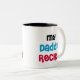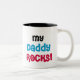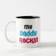 Daddy will smile when he sees his son or daughter wearing this cute My Daddy Rocks T-shirt or other item with the blue, red, and black text design.