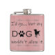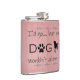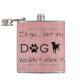 A perfect flask for those who prefer the company of dogs and the comforts of home! This flask design features text that says "I'd go...but my dog wouldn't allow it." with a paw print and dog silhouette embellishment against a pink wooden background. Additional gift items available with this design as well.