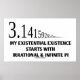 Showcase your pi fan side with this poster featuring the irrational and infinite number pi along with the following saying that will make others do a double-take on how you feel about pi: "My Existential Existence Starts With Irrational & Infinite Pi".