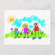 Cute cartoon childlike drawing of a family holding hands whilst standing outside on a sunny day. Image available on various gifts and products.