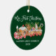 Modern Brush Script My First Christmas Baby Ornament includes Watercolor Gingerbread Train with candy, cookies and pines. Forest Green Background.