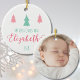 Celebrate your baby's first Christmas with our personalised ornament, designed to capture this precious milestone. One side features the phrase "My First Christmas," customisable with your baby's name and the year, accompanied by charming pastel Christmas trees. The other side showcases your favourite photo of your little one, creating a keepsake that will be cherished for years to come. This ornament is perfect for new parents, grandparents, or as a thoughtful gift for friends with newborns. Make this holiday season unforgettable with a unique and personal touch.