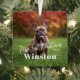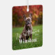 My First Christmas Custom Name Photo Holiday metal ornament with your pet’s name in a bold white serif font, the words "My First Christmas" and custom year below in a classic serif font.