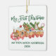 Modern Brush Script My First Christmas Baby Ornament includes Watercolor Gingerbread Train with candy, cookies and pines. Green.