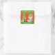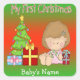 My First Christmas Girl Square Stickers features a green & red gradient background (customisable), a cute cartoon baby Girl in yellow Footed Pyjamas with red polka dots holding a candy cane, next to a decorated Christmas tree with gifts under it. Red & Gold stylised text is My First Christmas. There is text set up for your baby's name. Perfect gift for Christmas! To customise the background colour - Delete the background image - Click the Blue "Customise It" button, - Click on the "X" next to the background image, then Click on "Edit" then "Background", choose your colour and click on "Done".