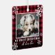 This festive square Christmas ornament is a sweet way to celebrate your dog or any pet’s first holiday season. The design features a bold black and red plaid (buffalo check) background on both sides for a cosy and classic holiday vibe. White snowflakes surround the photo and text on each side, with playful paw accents that add a fun, pet-loving touch.