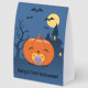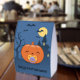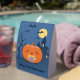 Adorable baby Halloween pumpkin with a pacifier. A dead tree, a creepy mansion, some bats, and the moon are seen on the background.