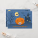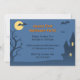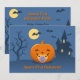Adorable baby Halloween pumpkin with a pacifier. A dead tree, a creepy mansion, some bats, and the moon are seen on the background.