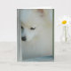 Photo greeting card with a white Pomeranian puppy dog looking down framed by wooded porch railing. Inside of card says "I miss you" in rope lettering. Fill in the text field to personalise or click on customise it to add/change font, size and/or colour on inside or out. A sweet card for a child away at school or camp. © Little Wing Photography & Design