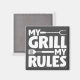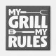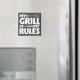 Fun barbeque graphic quote that reads: "My Grill My Rules", featuring a bbq fork and spatula. Click "Personalise" to change image and background colour! | Image by Badea Mihai | Shutterstock. Image ID: 1742273987 | Shutterstock® - All Rights Reserved.
