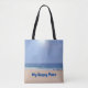 Original photograph of a beach with birds on the sand and surfers in the waves given a graphic illustrative treatment. The words 'My Happy Place' are on the front. These bags are great for carrying groceries, books, bible studies, toys, or use as a beach bag or gym bag; anything you need to carry around! These bags are 16” x 16” with a 28” strap. They have a black laminated lining for sturdy support as well. You can also add text as you like (such as someone’s name) on the back of the bag which is in a complimentary colour of ocean blue or leave as is.