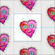 A smiling, contemporary art style emoji as a red heart shaped emoticon face in the bright, colourful Valentine colours of red, pinks, magentas and purples accented with other complementary colours.