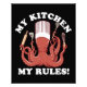 Octopus chef illustration with the text "My Kitchen, My Rules!". Funny graphic design for kitchen chefs and cooking lovers.