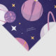 a space-themed pattern. This pattern features a variety of celestial objects and animals. There are planets of different sizes and colors, such as purple, orange, and yellow, along with a bright sun. Additionally, there are animated animals, including a pink elephant, a yellow lion, and a purple hippopotamus, floating amidst the celestial bodies. The background is a deep black, accentuating the bright colors of the planets and animals.