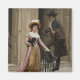 This design features a painting by Edmund Blair Leighton (1852–1922), who was an English painter of historical scenes. It shows a man entering a grand building as a woman enters. She is dressed in fine clothes, including a long flowing dress and fashionable hat, and the man is admiring her appearance. There is clearly some romantic tension between the couple. They may be well known to each other and in the early stages of courtship, or the man may be simply be admiring the woman's beauty in a passing glance. Either way, it is an elegant image of human attraction and romance. The woman is carrying a small black terrier dog in her arm and she looks nonchalantly towards the viewer; she knows her own worth. The gentleman is carrying a long overcoat on his arm. The original artwork was produced in 1894.