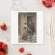 This design features a painting by Edmund Blair Leighton (1852–1922), who was an English painter of historical scenes. It shows a man entering a grand building as a woman enters. She is dressed in fine clothes, including a long flowing dress and fashionable hat, and the man is admiring her appearance. There is clearly some romantic tension between the couple. They may be well known to each other and in the early stages of courtship, or the man may be simply be admiring the woman's beauty in a passing glance. Either way, it is an elegant image of human attraction and romance. The woman is carrying a small black terrier dog in her arm and she looks nonchalantly towards the viewer; she knows her own worth. The gentleman is carrying a long overcoat on his arm. The original artwork was produced in 1894.