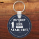 My Next Ride will be a Stair Lift in mixed white uppercase font with an icon image of a car, the silhouette of a senior citizen walking with a cane. Set inside a white circle of dots on solid dark blue.