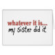 Whatever it is my sister did it funny baby clothes and t-shirts. Pass the blame to your sister with these hilarious shirts, buttons, hats and mugs. Cool sibling rivarly clothes, t-shirts and gifts.