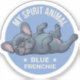 Flat cartoon blue French Bulldog lounges paws skyward, completely unbothered with half-lidded amber eyes on pastel background circle. "MY SPIRIT ANIMAL BLUE FRENCHIE" with stars—dog moms of rare blues, customise this chill sticker for gear or prints.