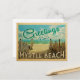 This Greetings From Myrtle Beach vintage postcard design features a sandy beach with a beautiful turquoise ocean water and above the sea, a blue sky with billowy white clouds. In vintage travels style.