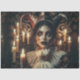 A haunting yet captivating harlequin, draped in deep, moody tones of black, indigo, and crimson, exuding an air of mystery and allure. Her piercing bright eyes glow with an almost hypnotic intensity, drawing you into her enigmatic expression.