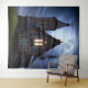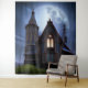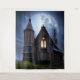 Mysterious looking Gothic house on a hill. Swirling skies and large full moon. A touch of the eerie, strange, Edgar Allan Poe.
