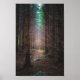 Landscape photo of a dark and mysterious spruce forest with a hint of green and a bright light in background.