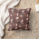 A spooky chic throw pillow featuring a pattern of snakes, mystical crystals, potions, spellbooks, candles, jars, skulls, tarot cards, and potions on a dark earth toned terracotta background.