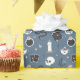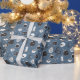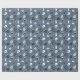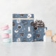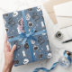 Spooky chic wrapping paper features a pattern of snakes, mystical crystals, potions, spellbooks, candles, jars, skulls, tarot cards, and potions on a dusty blue background.