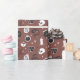 Spooky chic wrapping paper features a pattern of snakes, mystical crystals, potions, spellbooks, candles, jars, skulls, tarot cards, and potions on a dark earth tone terracotta background.