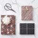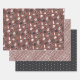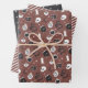 Spooky chic wrapping paper features a pattern of snakes, mystical crystals, potions, spellbooks, candles, jars, skulls, tarot cards, and potions on a dark earth tone terracotta background, with two additional colour-coordinated patterns.
