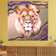 A majestic lion's face is depicted with bright blue eyes and a decorative jewel on its forehead, set against a background of swirling earthy tones. The lion's mane is richly detailed, creating a sense of regality and power.