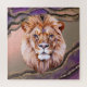 A majestic lion's face is depicted with bright blue eyes and a decorative jewel on its forehead, set against a background of swirling earthy tones. The lion's mane is richly detailed, creating a sense of regality and power.