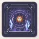 Mystic Sun Coaster featuring a mystical design inspired by astrology, esoteric, occult, and mysterious elements. This design has hues of blue, purple, and orange, a starry background, crystals, constellations, a sun with a face and moon phases. Includes a template for personal customisation.