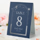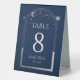 Mystical Blue Silver Sun Moon Stars Wedding Table Numbers Table Tent Sign features a silver sun, moon and stars frame on a blue background. Inside is your custom table number information. Designed for you by ©2022 Evco Studio www.zazzle.com/store/evcostudio