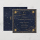 Mystical celestial wedding invitation featuring beautiful gold crescent moon, stars and clouds on a midnight blue background paired with elegant fonts for your personalised information.
