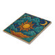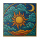 Gaze upon the celestial dance with this mesmerising decorative tile, featuring a vibrant sun, crescent moon, and swirling clouds against a deep cosmic blue. This ceramic accent piece beautifully captures the harmony of day and night, adding a touch of mystical charm and bohemian wonder to any room. Perfect for creating a focal point that inspires awe and contemplation. Immerse your surroundings in celestial beauty with this exquisite tile. This intricately designed tile showcases a brilliant orange and yellow sun at its centre, encircled by cool blue and turquoise clouds, a serene crescent moon, and twinkling stars, all set against a rich indigo sky. The golden border with elegant corner details and the sweeping arc element perfectly frame this ethereal scene. The vibrant sun, crescent moon, and swirling clouds makes its rich colours and intricate design create a truly enchanting statement. An ideal decorative accent for home decors seeking a free-spirited ambiance.