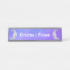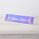 This desk or hanging name plate has two mystical white crescent moons with faces decorated with abstract shapes in blue, yellow, and purple on a purple sky. Customise your name with the template.