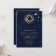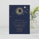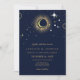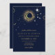 Celestial mystical personalised wedding invitation featuring galaxy milky way midnight sky with star dust, crescent moon and other astrological symbols in navy blue and golden colours. This card is easily editable. If you need help with the customisation of this card or you need more matching products for this collection kindly message me via Zazzle.