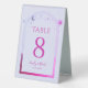 Mystical Lavender Pink Sun Moon Stars Wedding Table Numbers Table Tent Sign features a pink and purple sun, moon and stars frame on a pastel lavender background. Inside is your custom table number information. Designed for you by Evco Studio www.zazzle.com/store/evcostudio