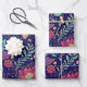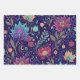 A richly detailed and enchanting seamless pattern set against a deep midnight blue background. It features stylized, vibrant lotus and fantasy flowers in striking, bright colors like magenta, turquoise, and coral, accented by whimsical swirling vines and golden leaves. Scattered elements of small stars, moons, and decorative dots add a magical, celestial touch. This intricate, bohemian, and luxurious design is perfect for wrapping gifts for birthdays, spiritual occasions, or anyone who loves intricate patterns and deep, jewel tones.