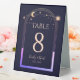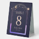Mystical Rainbow Dark Navy Blue Sun Moon Stars Space Astronomy Galaxy Celestial Wedding Table Numbers Table Tent Sign features a rainbow coloured sun, moon and stars frame on a dark navy blue background. Inside is your custom table number information. Designed for you by ©2024 Evco Studio www.zazzle.com/store/evcostudio
