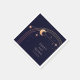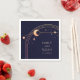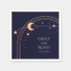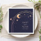 Mystical Celestial Rainbow Sun Star Moon Astronomy Space Wedding Napkins features sun, moon and stars with a gold frame on a dark navy blue background. Personalise with your names and date or custom text in the centre. Designed for you by © Evco Studio. Part of a collection at www.zazzle.com/store/evcostudio