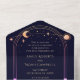 Mystical Rainbow Sun Star Moon Astronomy Space All In One Wedding Invitations features silver sun, moon and stars with a rainbow coloured frame on a dark blue background. Inside is your custom wedding invitation information. Below is the removable RSVP card with three meal choice options for you guests to remove and return. Personalise by editing the text in the text boxes. For additional number of meal choice options with this design please visit our store and view our collection. Meal type can be changed by simply editing the text in the personalise this design section. Personalise for individual guests by adding their custom names and addresses on each invitation. Designed for you by ©Evco Studio www.zazzle.com/store/evcostudio